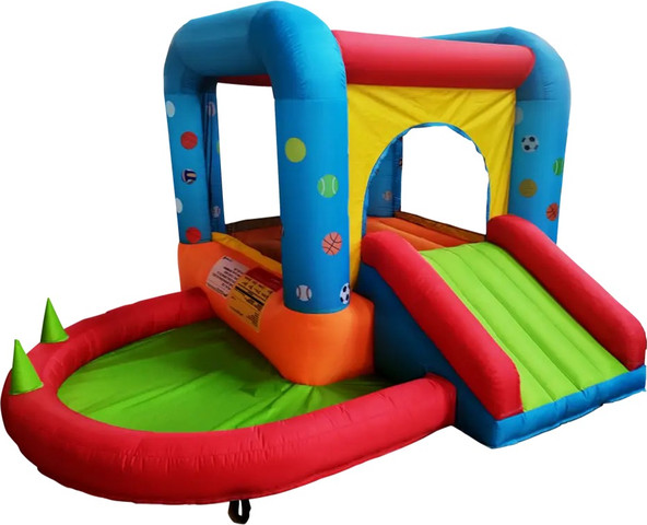 מתקן שעשועים מתנפח לילדים הכולל אזור בריכת פעילות מיםכדורים, אזור קפיצה בעל קירות רשת ומגלשה.